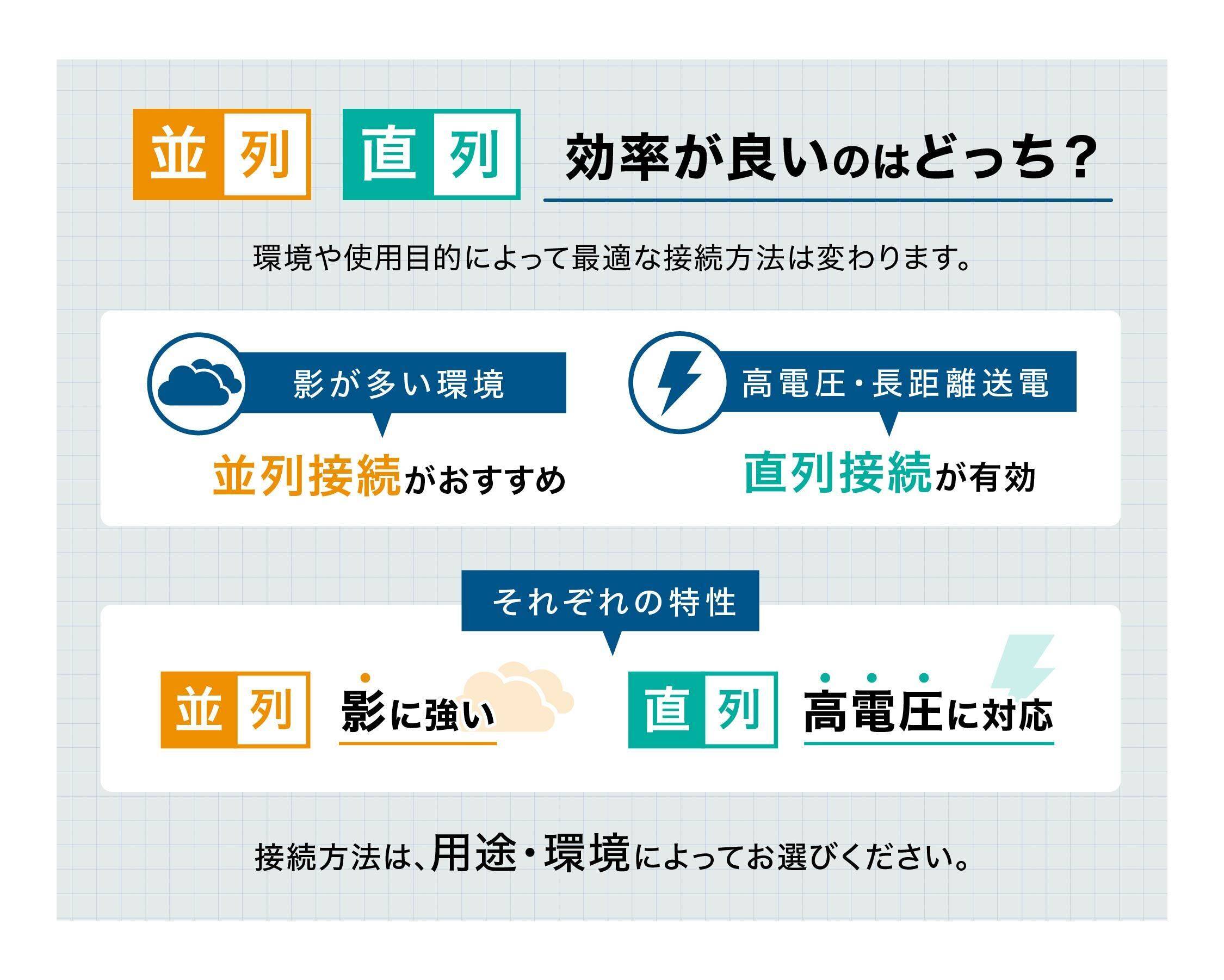 複数のソーラーパネルを組み合わせる際には、「直列接続」と「並列接続」の2種類の方式があります。どちらを選ぶかによって発電効